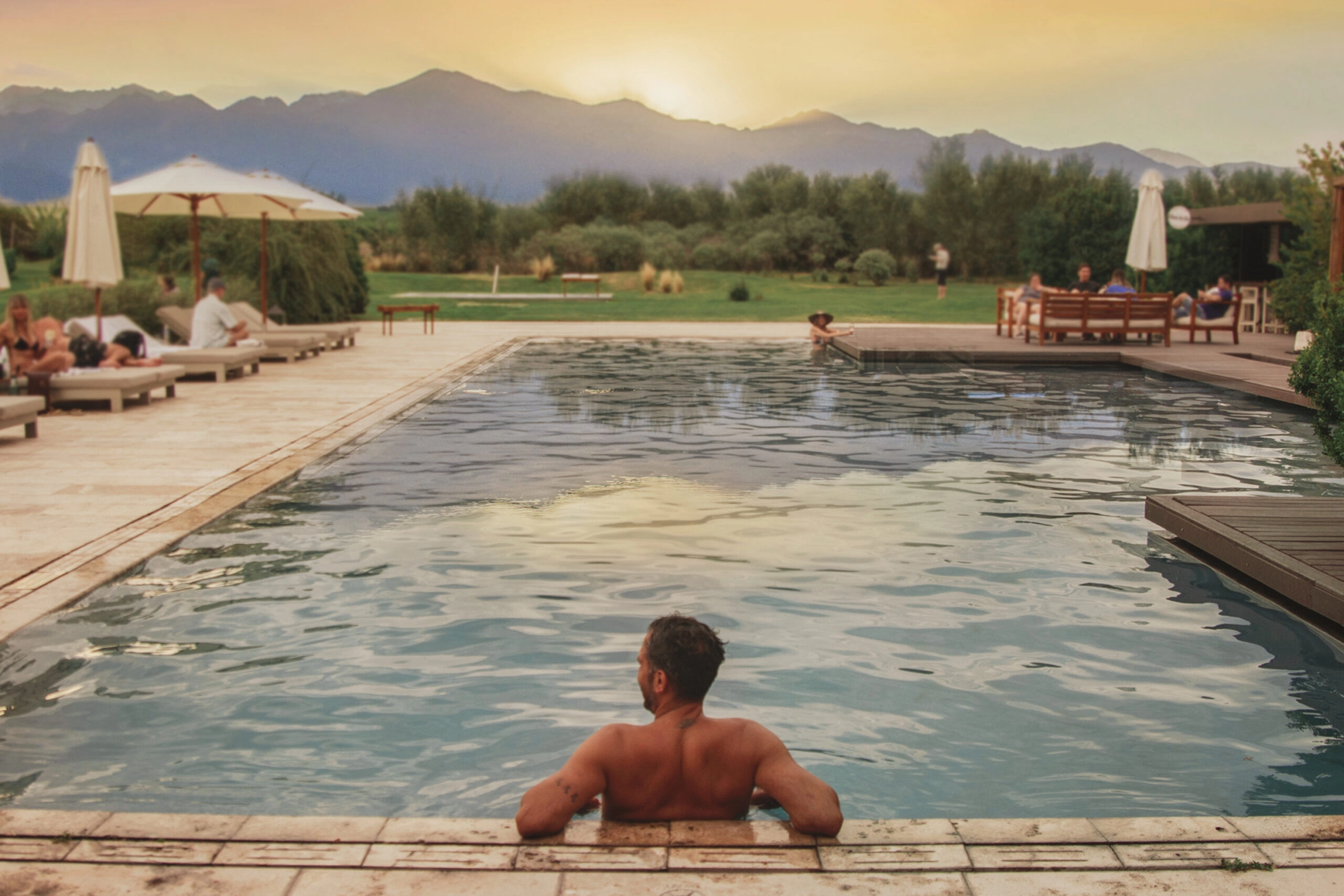 La tranquilidad de nuestra piscina, situada entre viñedos, con vista impactante hacia los Andes deja en todos los visitantes un recuerdo imborrable. La magia de los atardeceres, donde el cielo se tiñe de rojos y violetas, reconforta el alma mientras se disfruta de una copa del mejor Malbec del mundo.