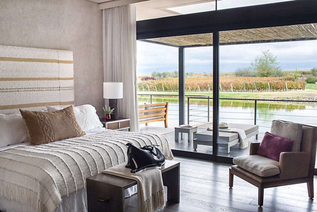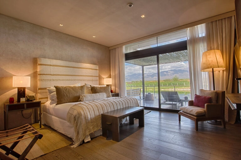 The resort’s 33 spacious villas feature expansive indoor/outdoor spaces; lavish spa-inspired bathrooms and private decks showcasing panoramic views of the Andes and vineyards, complete with outdoor replaces, soaking tubs, & intimate rooftop terraces.